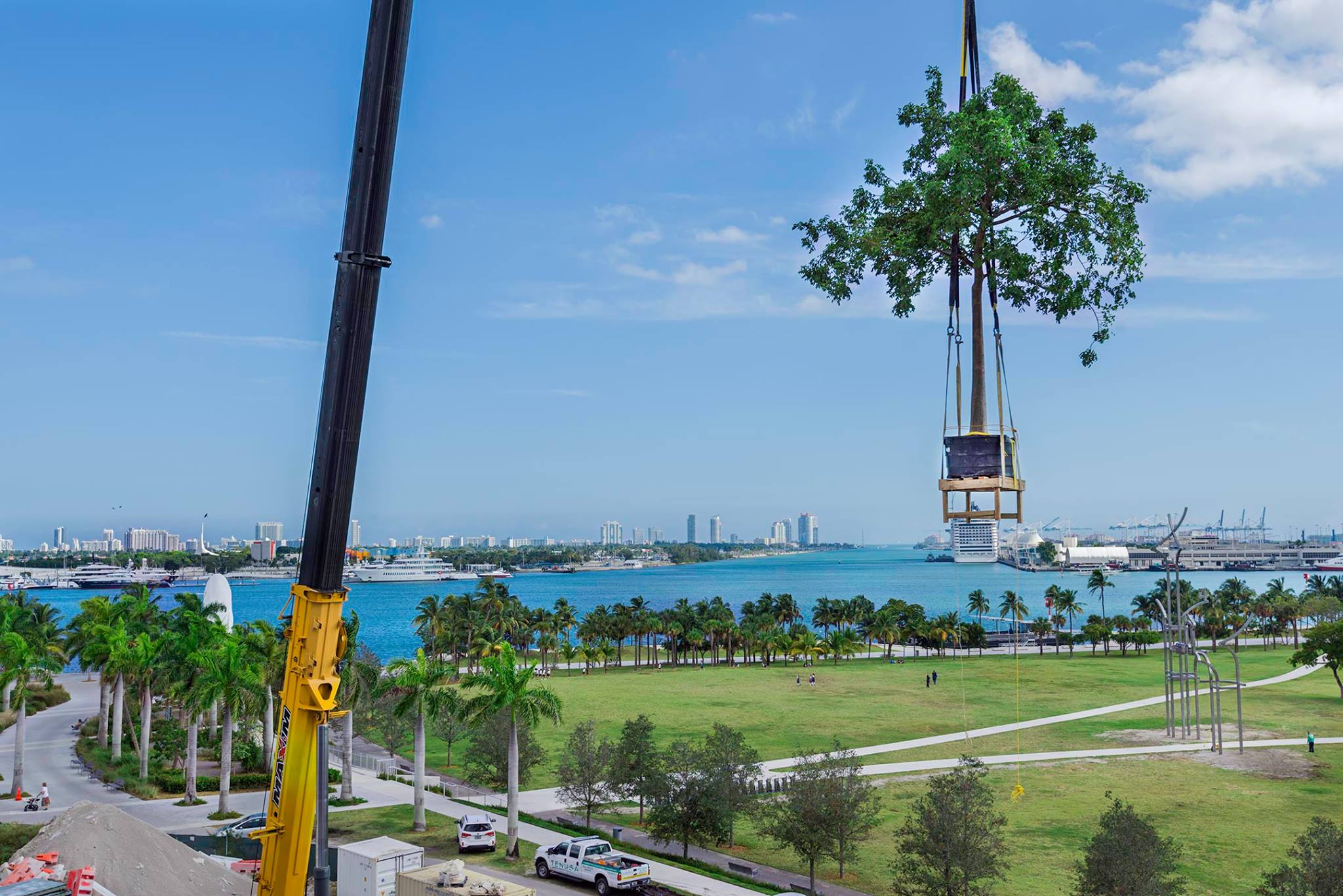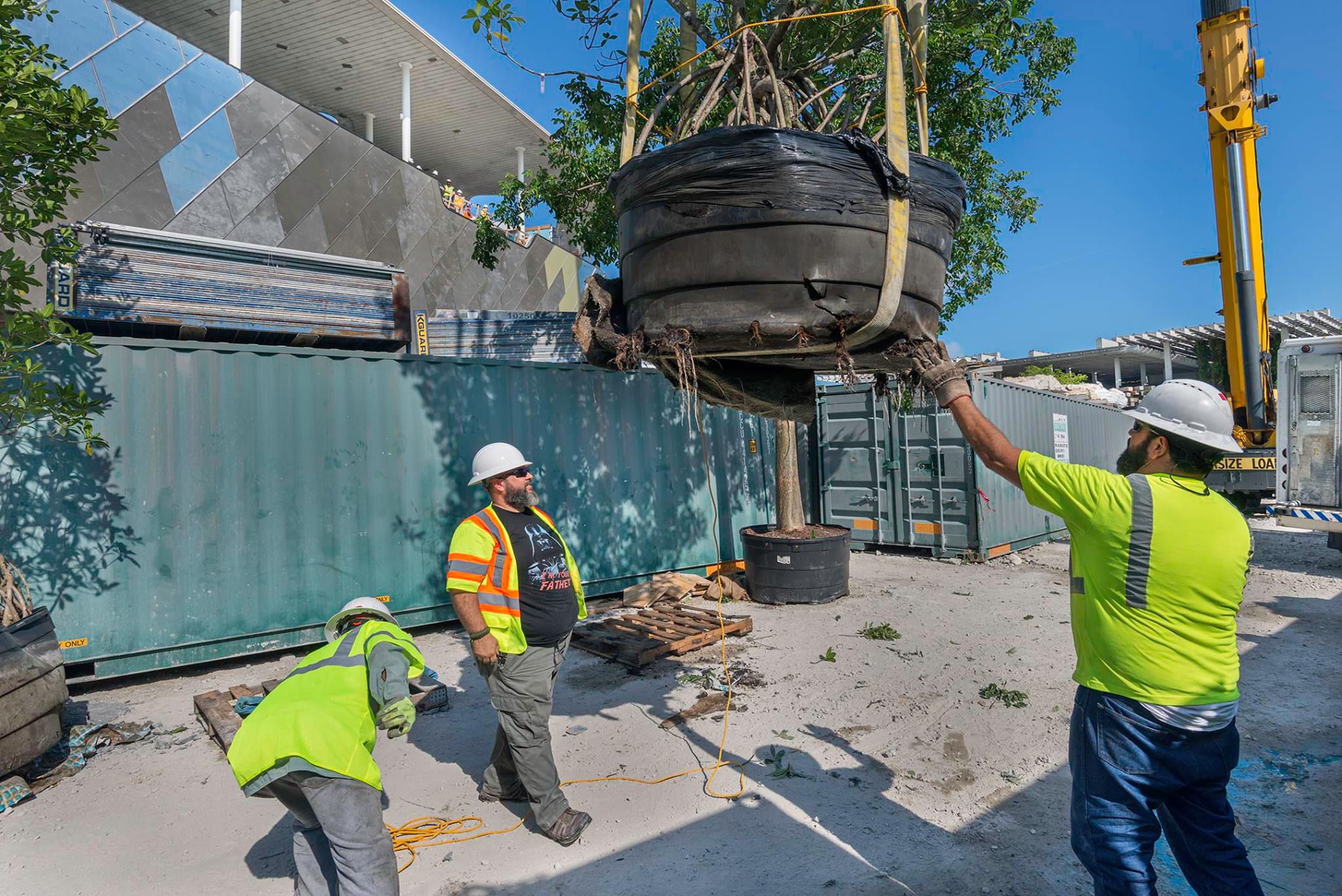Next, it was time to install the biggest tree to the Vista level: a 22-foot gumbo limbo (Bursera simaruba) with a 19-foot canopy spread. Because of its size, this tree was the toughest to maneuver. Once we had it appropriately strapped in, our gumbo limbo made the successful journey into its planter in the hammock area. We wrapped up our tree craning journey with the installation of a paradise tree (Simarouba glauca) and Krug’s holly (Ilex krugiana) into the same hammock.