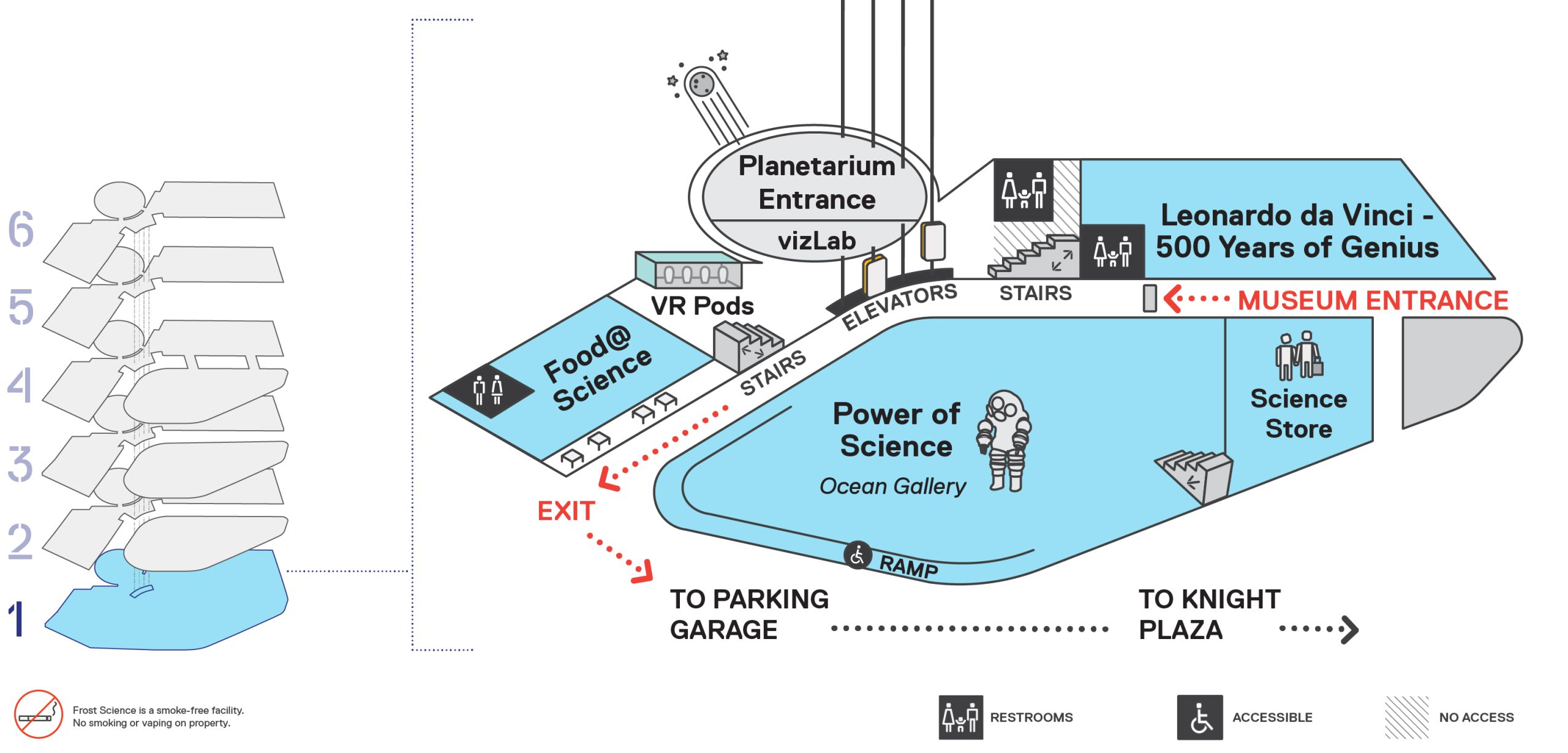 Museum map of each level in the Phillip and Patricia Frost Museum of Science and multi-lingual visit guides.